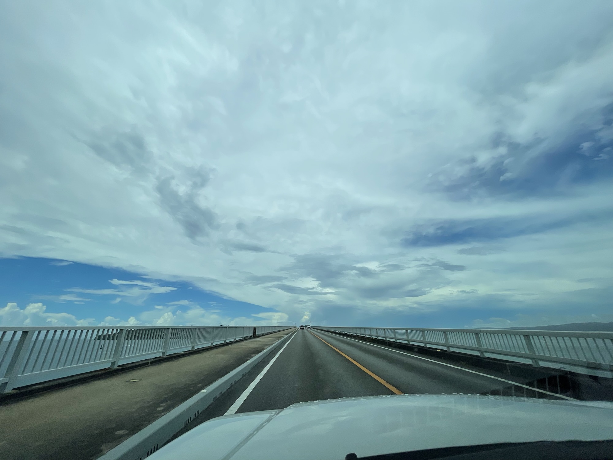まっすぐ伸びる橋の両脇には、青い海が見え、曇り空でもとても美しかったです。