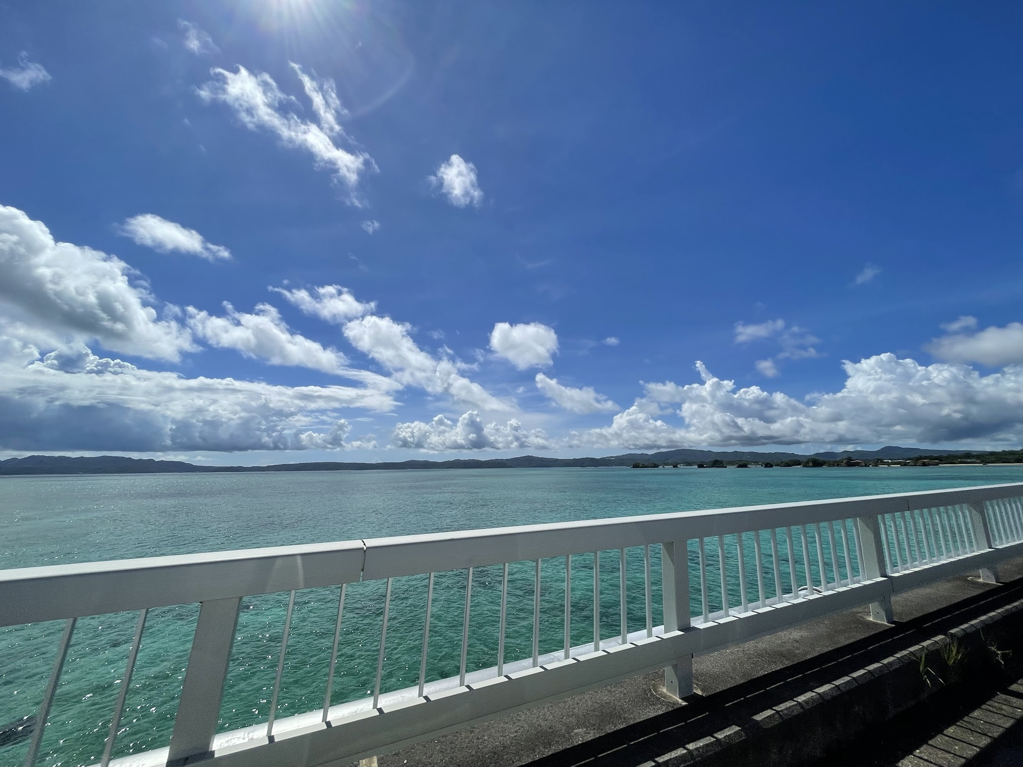 まっすぐ伸びる橋の両脇には、青い海が見え、曇り空でもとても美しかったです。