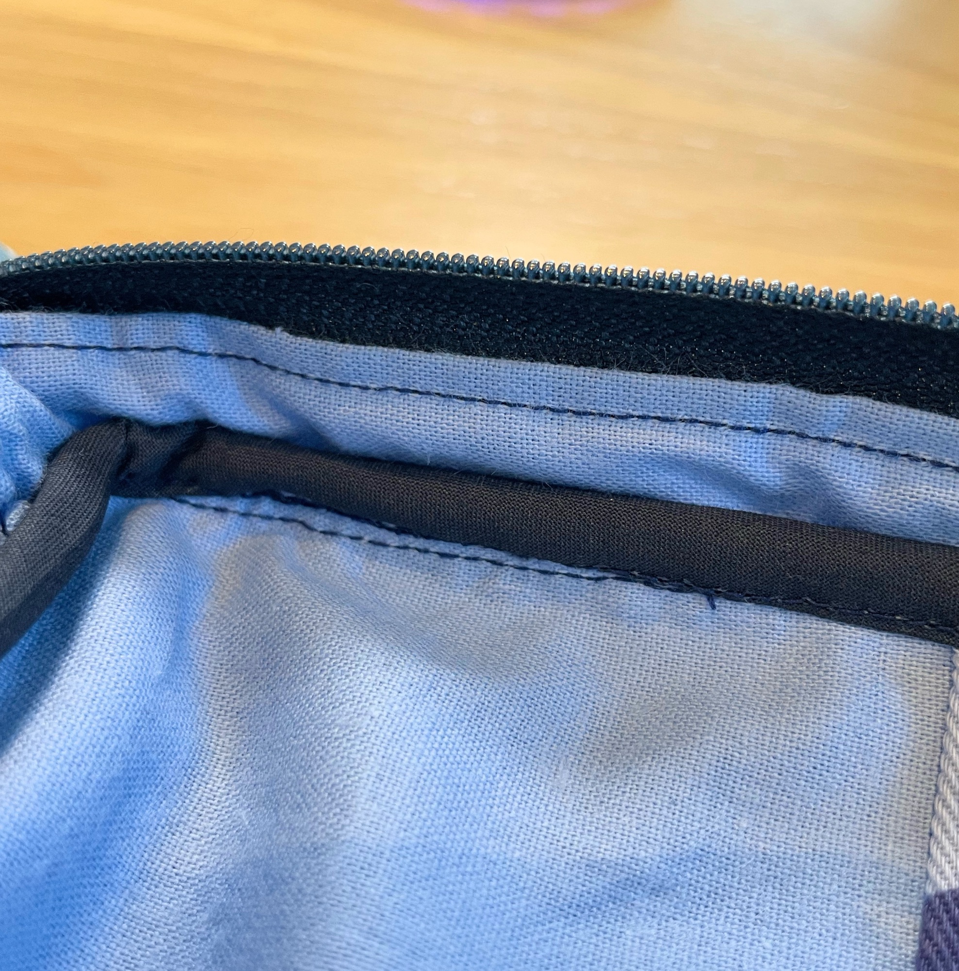 表布&裏布&接着芯が付いた部分を2枚重ねて、その上からのバイアステープ。ちょっと厚み的に無理がかかる場所でもあるのは確かです。